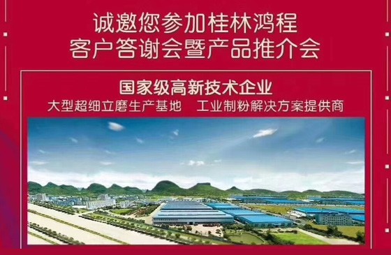 來源:桂林鴻程磨粉機廠家桂林鴻程公司2019年6月6日在河南南召縣舉行客戶答謝會 磨粉機廠家桂林鴻程公司計劃于6月6日在河南南召縣舉行客戶答謝會暨產品推介會,誠邀各界人士參...